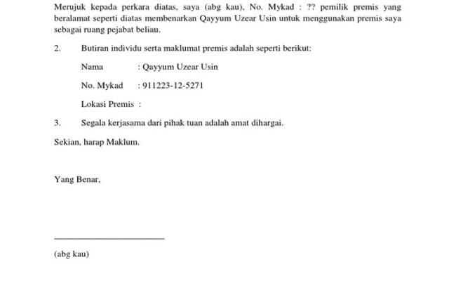 Contoh surat kebenaran menggunakan premis perniagaan nama dgn alamat abg kau kepada pihak yang berkenaan. Pada ruangan ini pemilik rumah sewa perlu menulis alamat rumah sewa nama. Siti nabillah bt mohd zon d23 kg muhibbah fasa 1 persiaran muhibbah 4 31100 sg siput perak darul.